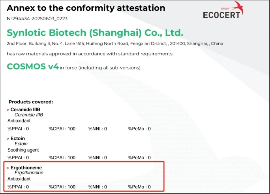 Shanghai Yunluo: Ergothione har opnået COSMOS-certificering